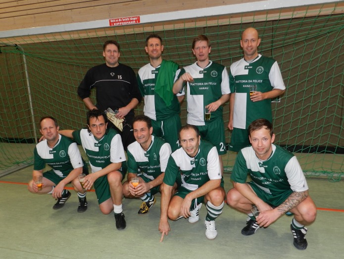 Mannschaftsaufstellung: Tor: Mohr Feld: Gibaja, Kunkel , Scardamaligia , Jan Schultheis, Kai Schultheis, Steinberg, Venturella, Jung Unsere Gruppenspiele 1.FCM - SG Rosenhöhel 3:1, 1.FCM - Spvgg. Langenselbold 4:0, 1.FCM - FC Büdesheim 2:1, 1.FCM - SV Assenheim 9:1 Platzierungsspiele: Platz 9 : FC Büdesheim Spiel um Platz 7 + 8 n.9m-Schießen : KSV Eichen - SV Assenheim 1:4 Spiel um Platz 5 + 6 n.9m-Schießen : SV Kilianstädten - Spvgg.Langenselbold 1:4 Spiel um Platz 3 + 4 : VfR Kesselstadt - SG Rosenhöhe 1:8 Endspiel: 1.FCM - FC 06 Erlensee 6:0 Torschützen: Kai Schultheis 8, Jan Schultheis 6, Jung 4, Gibaja 3, Venturella 2, Scardamaglia 1 Spielbericht: Gleich das erste Gruppenspiel war auch das beste des ganzen Turnieres. Gegen die starken SG Rosenhöhe Offenbach stand das Spiel auf Messers Schneide. Nach der Offenbacher Führung drehten wir noch das Ergebnis zu unseren Gunsten mit 3:1. Im zweiten Spiel nach anfänglichen Schwierigkeiten besiegte wir Langenselbold klar mit 4:0. Das dritte gegen Büdesheim war das schlechteste Spiel und wurde nach einem 0:1 Rückstand nur knapp mit 2:1 gewonnen. Der Gruppensieg wurde gegen Assenheim mit einem Kantersieg von 9:1 besiegelt. Das Endspiel gegen den anderen Gruppensieger FC 06 Erlensee war eine klare Angelegenheit. Mit 3 Toren wurden unseren Kontrahenten schnell der Wind aus den Segeln genommen. Das vierte Tor war nur noch eine Formsache. Über das gesamte Turnier hinweg verdiente sich die Mannschaft ein Lob. Ersatzkeeper Mohr machte seine Sache gut und mußte nur dreimal den Ball aus dem Netz holen. Die Schiedsrichter Hessenthaler und Christmann überzeugten und hatten keine Probleme. Im Rahmen des 100 jährigen Geburtstages des Vereins war dies der erste Turniersieg im neuen Jahr Bilanz des Turnieres: Spiele 5, Gewonnen 5, Verloren 0, Remis 0, Tore 24:3 BILD Note: 2 Turniersieger 1. FC 1913 Mittelbuchen Gesamtbilanz der gespielten Turniere: Spiele 9, Gewonnen 8, Verloren 1, Remis 0, Tore 31:7 |