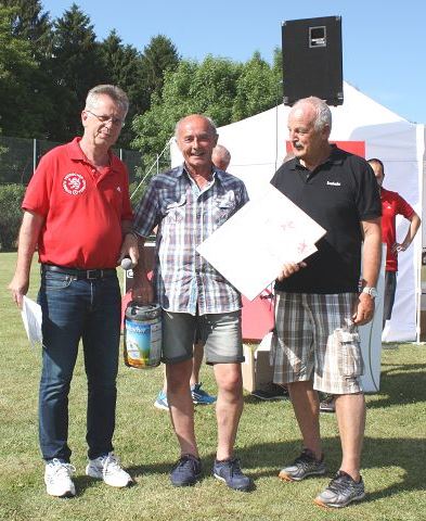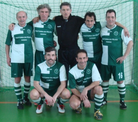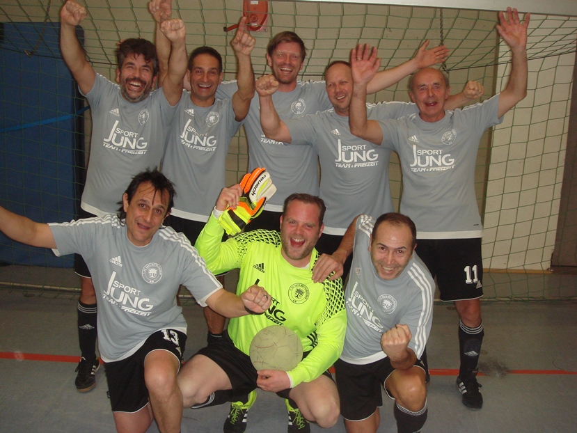 Erfolgreich den Titel des letzten Jahres verteidigt. Vorneweg war es sehr schön, daß unser Alttorjäger Venrurella (58) wieder mit an Bord ist. Das erste Spiel gegen Eichen/Ostheim war eine klare Angelegenheit. Venturella, Schidlo und Scaramaglia schossen den 3:1 Sieg heraus. Das zwischenzeitliche Gegentor brachte uns nicht aus der Fassung. Aus einem sicheren Abwehrverband (Rautesystem) einschließlich unserem mitspielenden Keeper Krauss beherrschten wir das Spiel. Das zweite Spiel gegen Rohrbach/Büches endete torlos, obwohl einiger gute Torgelegenheiten erspielt wurden. Auch in diesem Spiel ließen wir kaum Torchancen für den Gegner zu. Nach dem Punktverlußt mußte wieder ein Sieg her um die Chance auf das Finale zu erhalten. Gegen Assenheim begannen wir druckvoll und Venturella hatte gleich zwei riesige Torchancen. Doch im Eifer sein 1000 Tor für die AH zu erziehlen vergab er überhastet. Im dritten Versuch klappte für sein tausensde Tor und zu unserer Führung. (Nach dem Spiel gab es gleich eine Runde auf das tausensde Tor) Eine Unaufmerksamkeit brachte den Asssenheimern den Ausgleich. Wir blieben ruhig und Kunkel mit einem Kracher (Außenrist) in den Winkel schoß uns wieder in Führung, die er mit einem Alleingang ausbaute. Scardamaglia blieb es vorbehalten das 4:1 Endergebnis herzustellen. Gegen Oberau ging praktisch schon über den Einzug ins Finale. Bei Sieg klar im Finale, bei Remis Hoffnung, da Oberau noch ein Spiel hatte und bei Niederlage weg vom Fenster. Oberau begann druckvoll und hatte durchn zwei Fernschüße Pech, daß sie nur die Latte trafen. Dies war es aber auch, denn wir ließen nichts mehr zu. Einen klaren Strafstoß (Foul an Gibaja) verweigerte uns der Schiri. Auch ein für uns regelgerechtes Tor von Venturella pfiff er ab. So blieb es beim torlosen Remis. Jetzt mußten wir hoffen, daß Oberau im letzten Spiel nur mit zwei Toren Unterschied gewinnt, da wir dann das bessere Torverhältnis hatten. Der Gegner Assenheim lief erst nur mit drei Feldspielern auf, freundlicherweise half Ostheim/Eichen mit den vierten Mann aus. Nach einer 3:1 Führung für Oberau stellten sie das spielen ein und waren der Meinung im Endspiel erreicht zu haben. Ein kathastrophaler Irrtum zu Gunsten von uns, da wir um ein Tor besser waren. Das Finale gegen Oberdorfelden war eine klare Sache. Mit 3:0 behielten wir die Oberhand. Mit zwei Krachern in die lange Ecke brachte uns Scardamaglia auf die Siegerstrasse. Den Endstand von 3:0 blieb Venturella vorbehalten. Vor dem Turnier war die Hoffnung auf eine erfolgreiche Titelverteidung nicht emmenz groß, da wir mit einer doch älteren Mannschaft (Durchschnittsalter 50,25) angereist waren. Doch durch ein ruhiges Spiel, Disziplin, Abstimmung, Laufbbereitschaft und geschickter Aus- bezw. Einwechslungen konnten wir gegen die jüngeren Mannschaften locker mithalten. Wie schon erwähnt war das mit ins Spiel integrierten Keeper von uns ein wichtiger Faktor zum Sieg. Einen Akteur hervorzuheben wäre hier fehl am Platze, da alle Spieler über ihr Soll spielten.